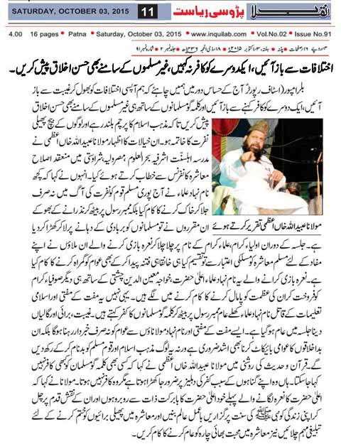 عبیداللہ نے کہا کہ نذرانہ کے بھوکے مقرروں نے مسلم معاشرہ کومسلکی اعتبار سے تقسیم کیا ہے۔ ہمیں چاہیے کہ مسلکی اختلافات کو بھول جائیں، ایک دوسرے کو کافر کہنے سے باز آئیں۔ مفت کے مفتی کھلے عام منبر رسول پر بیٹھ کر کلمہ گو مسلمانوں کو کافر کہتے ہیں۔ کسی بھی کلمہ گو مسلمان کو کبھی بھی کافر نہیں کہا جاسکتا۔